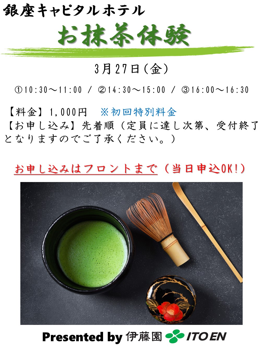 2026年3月27日(金)、銀座キャピタルホテル茜にてお抹茶体験イベントを開催いたします。 当イベントでは、講師に教わりながら実際にお客さまご自身でお茶を点てる体験をお楽しみいただけます。 イベント詳細につきましては、添付のチラシをご確認ください。 お申し込みは、茜・萌木両館のフロントにて3月23日(月)より開始いたします。 (※定員に達し次第、受付終了……